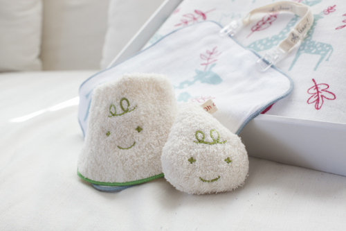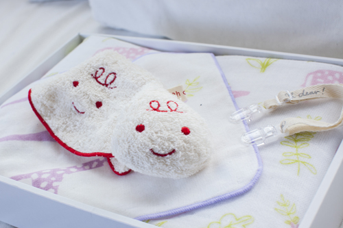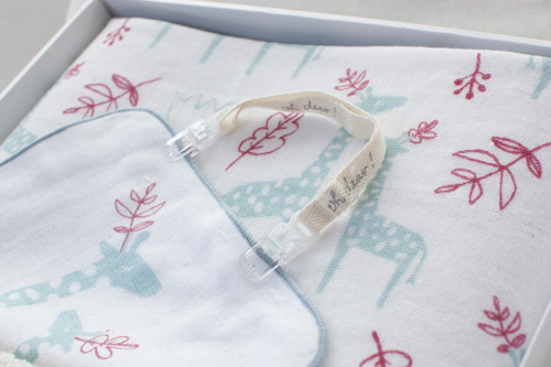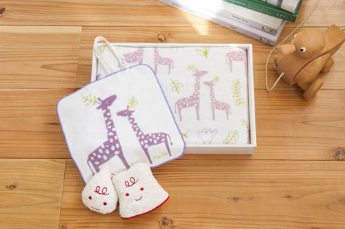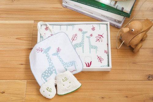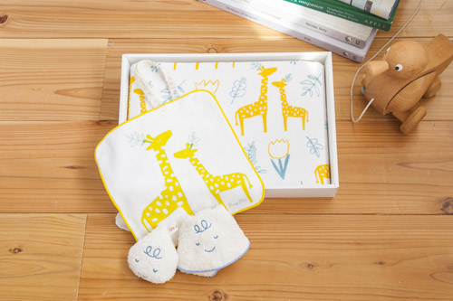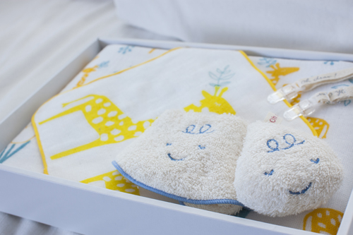 オーガニックコットンガーゼケットとハンカチ2枚、そしてにぎにぎのギフトセットです。